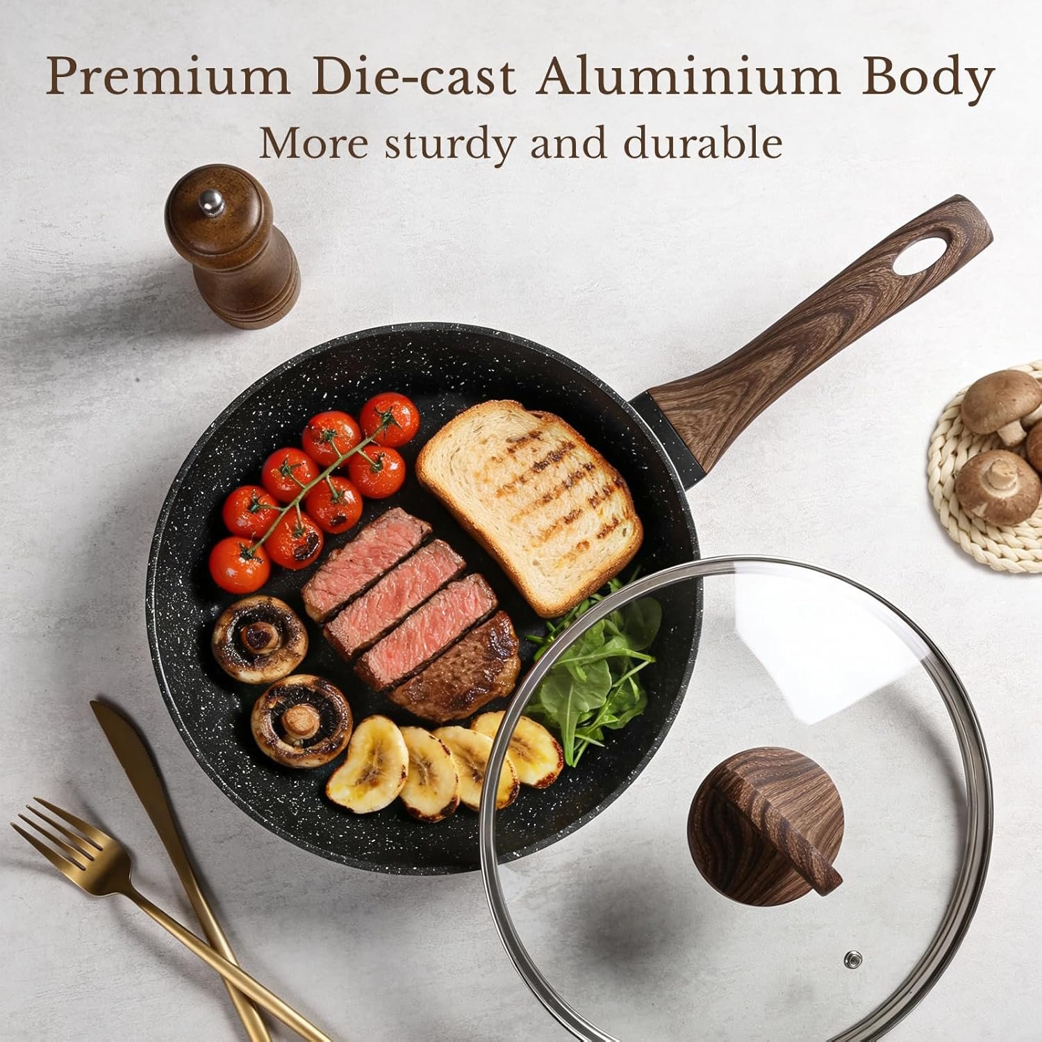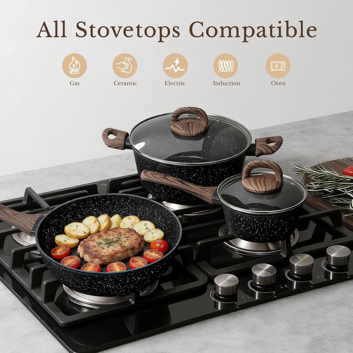 The EWFEN 25 Piece Pots and Pans Set is a complete nonstick ceramic cookware set designed for healthy, everyday cooking. Made with a non toxic ceramic coating that is PFAS, PTFE, and PFOA free, this set ensures safe food preparation while offering smooth food release and easy cleanup. With large capacity pots and pans, induction compatibility, and a sleek classic black finish, it’s an ideal choice for home cooks looking for durable, eco friendly cookware that performs reliably on all stovetops.